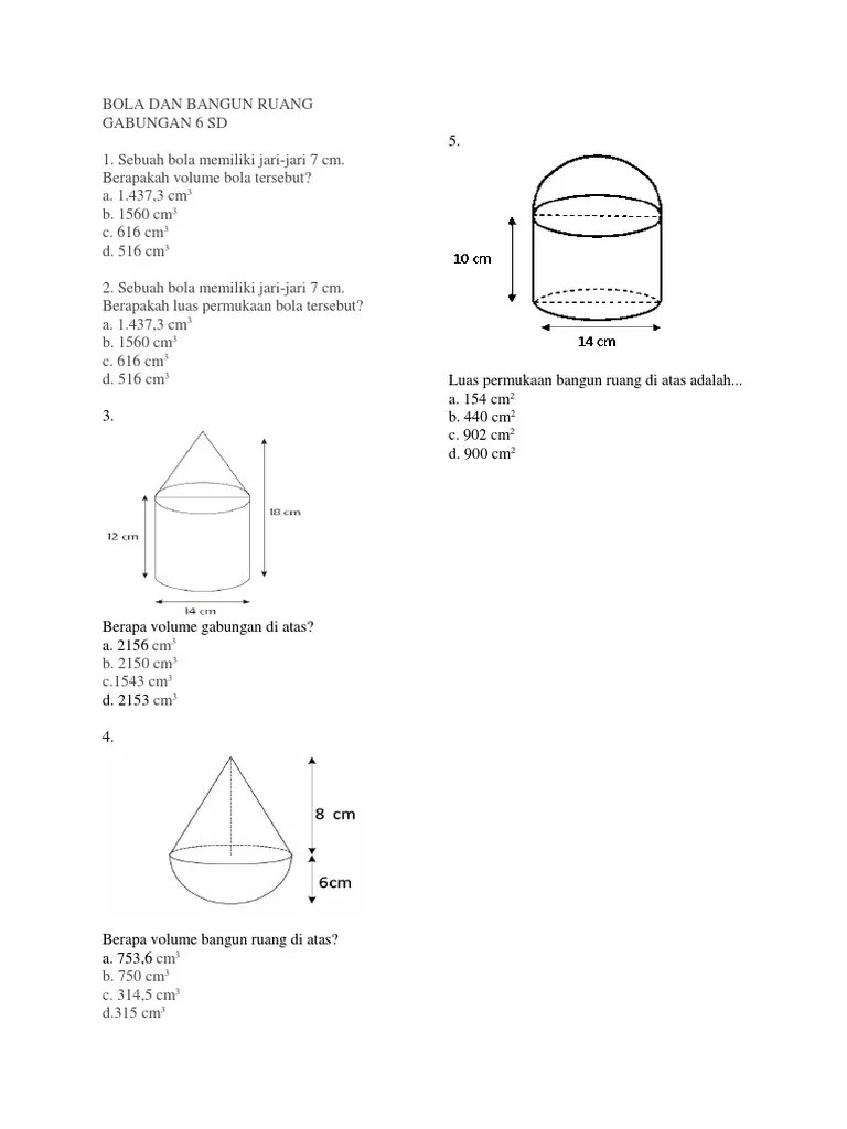 Volume Bola Soal Volume Bangun Ruang Gabungan Kelas 6 / Materi Dan Soal Matematika Tentang Luas Dan Volume Gabungan Bangun Ruang Untuk Kelas 6 Sd Liang Solusi : Volume bangun ruang adalah hasil kali dari luas alas dengan tinggi bangun ruang tersebut.